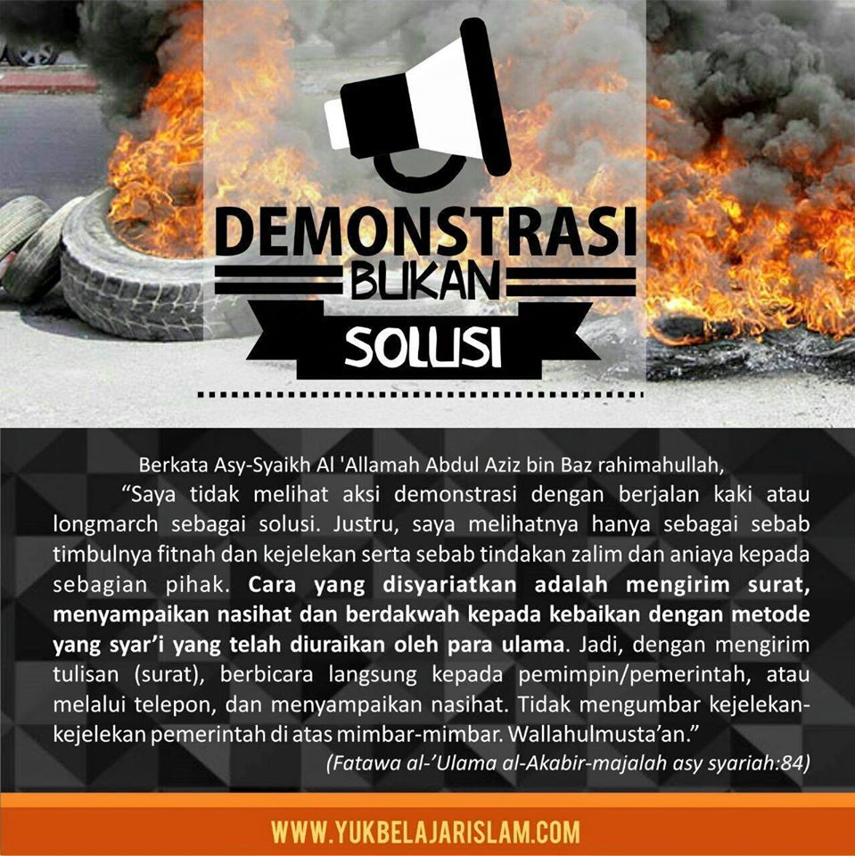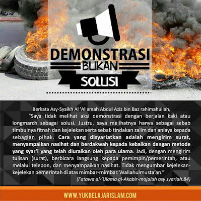 ” Demonstrasi termasuk perkara yang baru dalam agama, dan setiap perkara yang baru dalam agama itu adalah bidah dan setiap bidah itu sesat dan setiap kesesatan itu di neraka. Yang demikian itu karena syariat Allah itu telah sempurna, kitab dan sunnah.