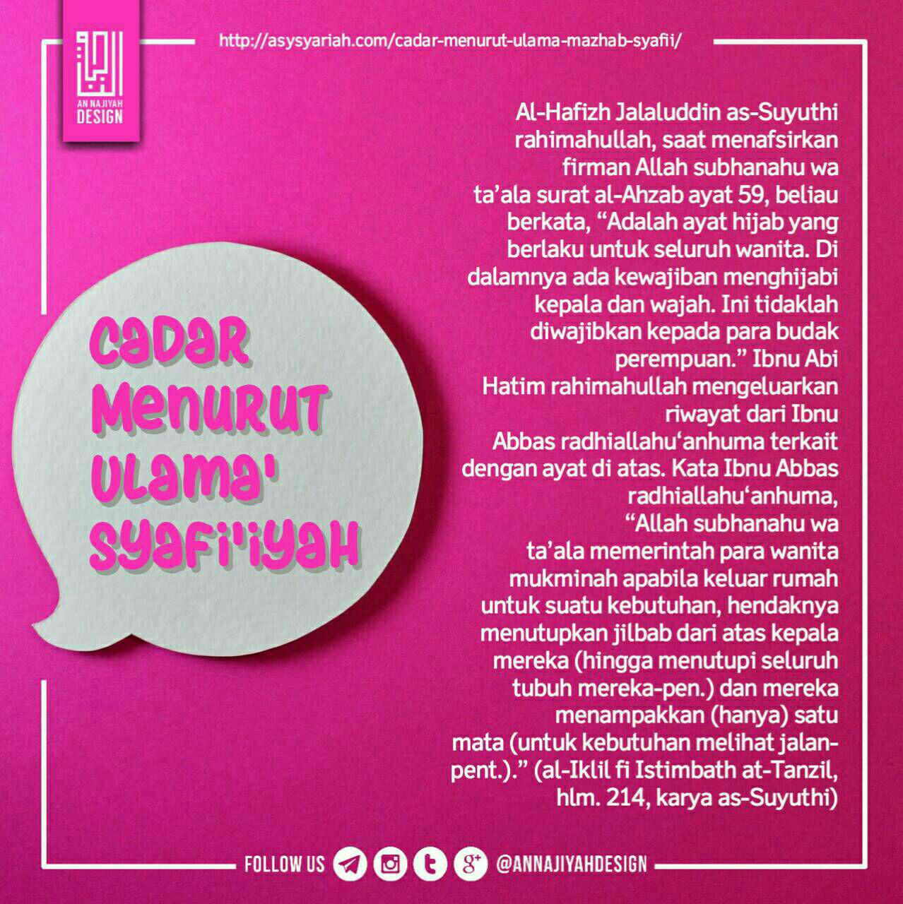 “Wahai Nabi, katakanlah kepada istri-istrimu, anak-anak perempuanmu, dan istri-istri orang mukmin, hendaklah mereka mengulurkan jilbab mereka ke seluruh tubuh mereka.” (al-Ahzab: 59)